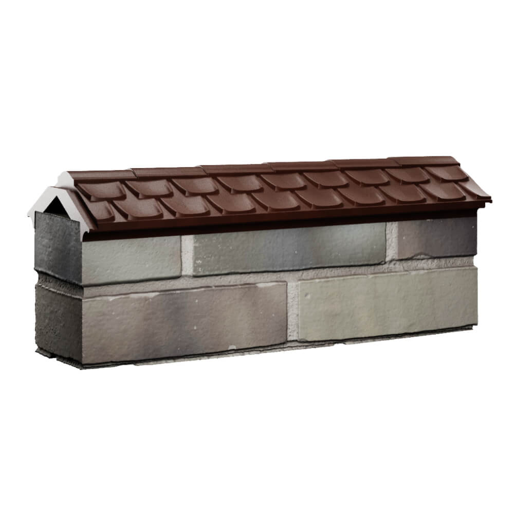 Парапет Elbrus Коричневый 175 х 510 х 65 мм с посадкой на 0.5 кирпича (130 мм) под натуральную черепицу может быть применен как в цокольной, так и в верхней части забора в виде конька.